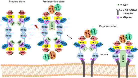The lipolysis-stimulated lipoprotein receptor (LSR) and the cluster of differentiation 44 protein (CD44) are identified as two main membrane-bound host cell receptors that can interact with CDTb (Figure 4). LSR is composed of an extracellular immunoglobulin-like domain, a short transmembrane helix, and a long cysteine-rich intracellular domain []. This type I single-pass transmembrane protein of 581 amino acids is highly expressed in the liver and other tissues, such as the small intestine, colon, kidney, and lung []. Although LSR belongs to a family of the immunoglobulin-like domain containing receptors, which are involved in the formation of tricellular tight junctions upon cell contact of epithelial cells, only LSR functions as a receptor for CDT []. Notably, LSR also acts as the cellular receptor for other binary toxins such as C. perfringens iota toxin and C. spiroforme toxin, which have almost 90% sequence homology in their respective binding domains to CDTb.