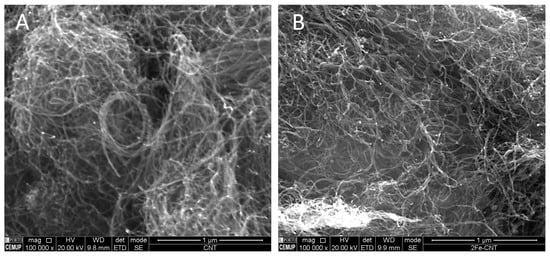 The results of the textural and elemental analysis of the different CNM are presented in Table 1. CNT are mesoporous nanomaterials, presenting a specific surface area (SBET) of 201 m2 g−1 and pore volume (Vp) of 0.416 cm3 g−1. The functionalization procedures applied promoted a slight increase of these two parameters, both in CNT_N and in CNT_HNO3 (Table 1), showing the occurrence of changes on the CNT structure. The oxidative treatment may cause breaks on the walls and open up of the tips of the nanomaterial, leading to a slight increase of the SBET []. On the other hand, the CNT_N samples were submitted to a ball milling, which promotes a better dispersion of the CNT in the first stage of the process, and leads to shorter CNT by breaking up the tubes without affecting their diameter []. Previous CNM characterization by TEM [], revealed that pristine CNT structure consisted in aggregates of tubes highly entangled, curved, and twisted with each other, and that the ball-milling (sample CNT_N) reduced significantly this entanglement because the mechanical treatment breaks up the tubes, shortening the CNT, and increasing the surface area (Figure S1; Table 1). Thus, the functionalization procedures applied improved the accessibility of the nanotubes, and the increasing of SBET on the CNT’s disentangling could be associated with the increase of the Vp. On the other hand, despite the CNT impregnated with 2% of iron demonstrating a slight decrease in the surface area, this decrease is not considered significant since the iron quantity introduced in the carbon network is low, being the surface area of these CNM maintained similar to the original CNT (Figure 1). Scanning Electron Microscopy with Energy Dispersive Spectroscopy (SEM/EDS) analysis of CNT and CNT@2%Fe samples confirms that these CNM are tubes highly entangled and twisted, and that the impregnation of Fe on CNT structure was successful (Figure 1C).