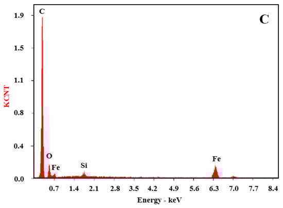 Scanning Electron Microscopy (SEM) images of (A) carbon nanotubes (CNT) and (B) CNT@2%Fe and (C) Energy Dispersive Spectroscopy (EDS) analysis of CNT@2%Fe sample.
