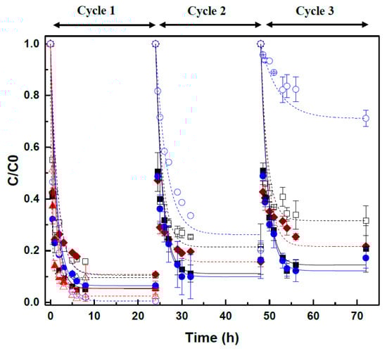 The results of the first 24 h suggest the combined contribution of adsorption and biological activity in the removal of CIP. However, regarding the slight differences observed in this first cycle between the blank, abiotic, and biological assays, it was difficult to distinguish between the different phenomena contributing for CIP removal, because in this cycle adsorption may be the main mechanism, once biomass and CNT are not yet saturated (Figure 2).