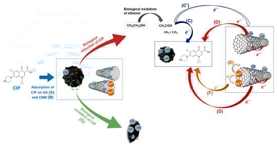 The obtained results, taken all together, point to the occurrence of different mechanisms of CIP removal, namely adsorption on sludge and/or on CNM, and biological removal by oxidation and/or reduction, which are accelerated by the presence of CNM (Figure 3). The results suggest that adsorption phenomena likely occurred in the beginning until saturation of GS and CNM, and biological reactions prevailed after reaching the adsorption/desorption balance. In fact, in the biological assay with ethanol and without CNM, adsorption of CIP on GS and its reduction due to electrons generated by the oxidation of ethanol, or biological oxidation of CIP, possibly occurred (Figure 3). The event of biological reduction of CIP by the electrons generated from the oxidation of ethanol (Figure 3C,C’) probably explain the higher percentage of removal as compared with the assay without substrate where only adsorption (A) and biological oxidation may occur (Figure 3G). When CNM are present, besides absorption of CIP on GS and on the nanomaterials (Figure 3A,B), respectively), improvement of the reaction rates by the CNM, which act as electron shuttles, may justify the high extent of removal (Figure 3C’–D).