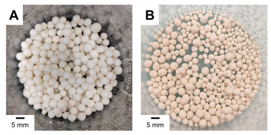 The pore size distribution (data not presented) showed that all the obtained beads mainly contain pores up to 10 nm in size, including micropores. Pores with a larger diameter (over 0.1 mm) were also observed; however, their volume for each sample was only 0.02 cm3/g. They may be referred to as inter-grain spaces (cavities), which are probably formed during the cross-linking of the alginate and drying process.
