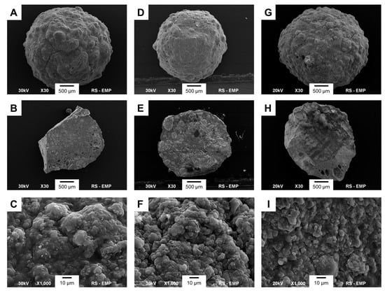SEM images of CS-RAL (A–C), KER-RAL (D–F), and CS/KER-RAL (G–I). First line: whole bead at ×30 magnification; second line: internal cross-section at ×30 magnification; third line: outer surface at ×1000 magnification.
