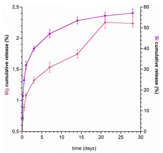 In the first step, the release of magnesium and silicon ions from the starting powder (Mg,Si-HA) for bead fabrication was carried out. Figure 3 shows the cumulative release curves for the ions over four weeks. Interestingly, there are significant differences between the release profile of magnesium and silicon. Magnesium is released gradually and in very small quantities, up to 2.4% of its total content after four weeks. Furthermore, the burst release effect can also be observed for up to 24 h, although, during this time, only slightly more than 1% of the total amount of Mg introduced into the powder is released (see Figure 3). A different release profile applies to silicon, where up to 57% of the introduced element was released within four weeks, and approximately 30% within 24 h.