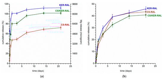 Taking into account the small amount of magnesium introduced into the Mg,Si-HA sample (0.26 wt%) (resulting from the substitution limit), we decided to increase its content in the obtained beads by using Mg2+ as a cross-linker for sodium alginate. It is worth adding that, conventionally, aqueous calcium solutions are used to cross-link alginates. Figure 4a shows the magnesium release from the obtained beads. As expected, the amount of Mg released from the beads increased significantly compared to that released from the powder. The CS-RAL sample exhibits the lowest amount of Mg released to the medium. It should be noted that this type of bead is also characterized by the lowest porosity. Therefore, Mg2+ ions from the cross-linking solution had difficulty accessing the interior of the beads and penetrated them poorly, and, in addition, were released to a lesser extent. During the formation of more porous granules (KER-RAL and CS/KER-RAL), the Mg ions from the cross-linking solution not only binded to alginate but also adsorbed on the bead porous structure. This is why the amount of release magnesium was so high and exceeded 100—100% corresponds to the average amount of cross-linked magnesium ions, however, each type of granule has a different binding capacity.