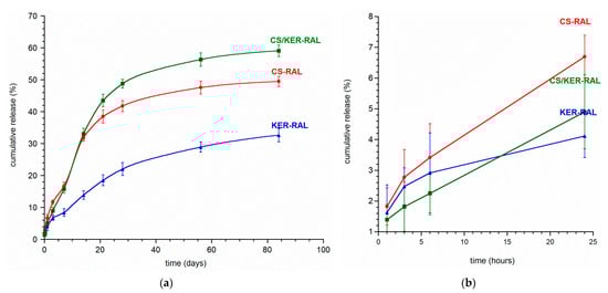 (a) Raloxifene hydrochloride release profile from CS-RAL, KER-RAL, and CS/KER-RAL over 12 weeks; (b) Raloxifene hydrochloride release profile from CS-RAL, KER-RAL, and CS/KER-RAL during the first 24 h.