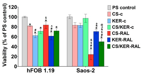 Evaluation of cell viability after 48-h exposure to granule extracts by MTT assay (hFOB 1.19—human normal osteoblasts; Saos-2—human tumor cells derived from osteosarcoma; PS control—polystyrene extract as a negative control of cytotoxicity; * statistically significant results compared to PS control, # statistically significant results compared to CS; $ statistically significant results compared to KER; & statistically significant results compared to CS/KER; ^ statistically significant results compared to CS-RAL; @ statistically significant results compared to KER-RAL; p < 0.05, one-way ANOVA followed by Tukey’s test).