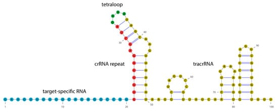 A native CRISPR/Cas system was discovered in microbes where it functions as an adaptive immune mechanism protecting against invading viruses []. The majority of prokaryotic genomes contain characteristic CRISPR locus with short (about 30 bp, on average) repeats interspaced by unique sequences of similar size [,,]. These spacers are phage DNA fragments of variable sequences acquired by a microbe during past phage infections []. Each spacer and repeat pair are transcribed to CRISPR RNA (crRNA), which hybridizes with another RNA molecule, a small trans-activating crRNA (tracrRNA), to form a guide RNA (gRNA). Hence, gRNA is composed of the tracrRNA with a stem loop structure due to conserved nucleotide sequence and the crRNA molecule with 20 nt variable sequence at 5′ end that can hybridize to a complementary DNA strand. Cas protein, or usually a complex of various Cas proteins, forms a ribonucleoprotein (RNP) complex with gRNA, which guides the protein to the target phage DNA at the location with complementary sequence next to a short protospacer adjacent motif (PAM) of conserved, usually 3–6 nt sequence [,]. Then, Cas protein destroys phage DNA by its cleavage []. Further discoveries have paved the way for the utilization of this natural defense mechanism and have led to the development of CRISPR/Cas-based systems for DNA editing and research in eukaryotic organisms. In particular, it was found that about 100 nt long, single gRNA composed of crRNA and tracrRNA fragments linked with a tetraloop (Figure 1) can be used instead of a native hybrid gRNA []. In consequence, designing gRNA to target the desired DNA location as well as the delivery of gRNA to target cells was simplified and single gRNA has become routinely used.