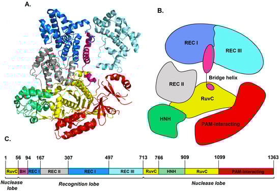 The structure of Streptococcus pyogenes Cas9 protein, which contains seven domains: Rec I, Rec II, REC III, Bridge Helix, RuvC, HNH, and PAM-interacting. Domains are presented in crystal (A), schematic (B), and map (C) form. Crystal image was rendered from RCSB PDB ID: 4CMP [], using PyMOL software (Schrödinger Inc., New York, NY, USA).