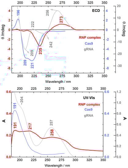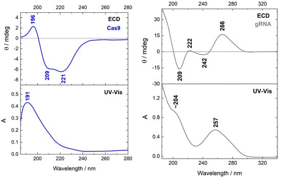 ECD and UV-Vis spectra of Cas9 protein (blue line, C = 9.35 × 10−7 M) and gRNA (gray line, C = 1.07 × 10−5 M).