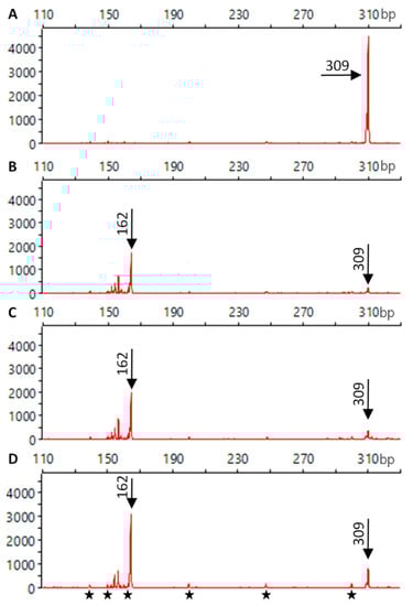 Electropherograms of ROX-labelled DNA fragments detected by a capillary electrophoresis. Untreated DNA of 309 bp in length (A), DNA incubated with the untreated RNP complex—control (B), DNA incubated with the RNP complex containing ECD-measured Cas9 (C), DNA incubated with the ECD-measured RNP complex (D). Stars—GeneScan™ 500 LIZ size marker.