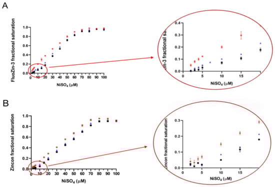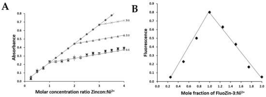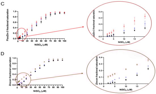 2.5. Determination of the ZnT8c Ni(II) Complex Stoichiometry with Fluorescent (Fluozin-3) and Colorimetric (Zincon) Indicators