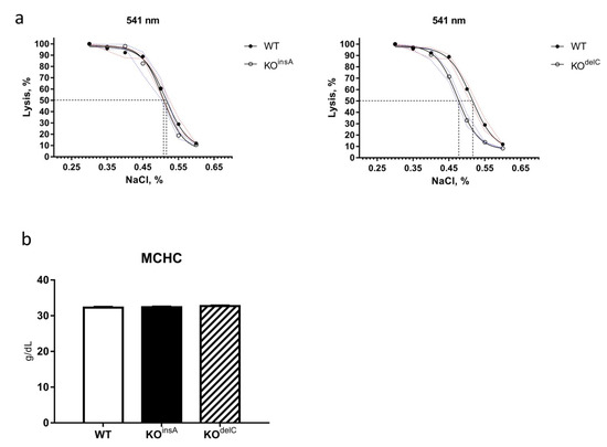 To evaluate if the lack of TAAR9 affects physiological functions we first performed the hematological analysis in these rats. Osmotic fragility test (OFT) is one of the standard clinical tests for diagnosis of blood pathologies such as hereditary spherocytosis, autoimmune hemolytic anemia, and other erythrocyte abnormalities [23]. Hemolysis of RBC is a process of releasing hemoglobin into the plasma as a result of a ruptured erythrocyte membrane. Osmotic fragility is affected by various factors, including membrane composition and integrity, as well as the cell sizes or surface-area-to-volume ratios [24]. To evaluate the potential role of TAAR9 in erythrocyte pathologies, we tested both strains of TAAR9-KO rats in the OFT test. Whereas TAAR9-KOdelC rats showed a reduced percentage of hemolysis in comparison to WT, this phenotype was not confirmed in the TAAR9-KOinsA strain (Figure 2a). Furthermore, no differences between mean corpuscular hemoglobin concentration (MCHC) levels were observed between genotypes (Figure 2b). From these results, we conclude that the lack of the TAAR9 gene is not causing prominent spherocytosis pathology on the stage of differentiated erythrocytes.