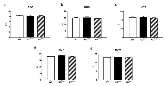 Other RBC measurements, including red blood cell count (RBC), hemoglobin (HGB), hematocrit (HCT), mean corpuscular hemoglobin (MCH), red blood cell distribution width (RDW), showed minimal changes between genotypes (Figure 4).