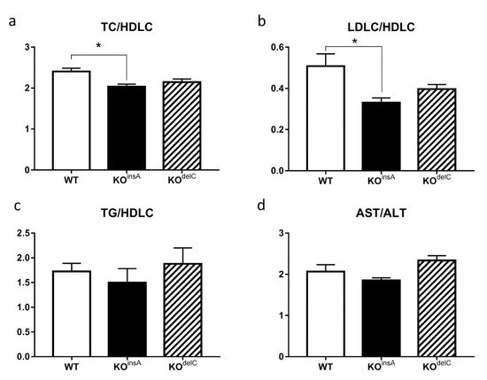 Comparative analysis of biochemical parameters in the blood of TAAR9-KO and WT rats. (a) Total cholesterol/high-density lipoprotein ratio (TC/HDLC), (b) ratio of low-density lipoprotein cholesterol and high-density lipoprotein cholesterol (LDLC/HDLC), (c) ratio of triglyceride/high-density lipoprotein cholesterol (TG/HDLC), (d) de Ritis ratio (AST/ALT). Biochemical analysis revealed a decrease in TC-to-HDLC ratio and LDL to HDL cholesterol, the main predictive factor of atherosclerosis in human [25], in TAAR9-KO rats, but statistical significance was observed only in TAAR9-KOinsA strain. Data are mean ± SEM, * p < 0.05 vs. WT, ANOVA with Tukey’s post-hoc test, n = 7 per group.