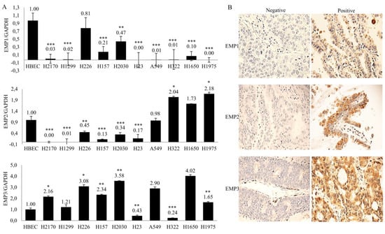 Expression analysis of epithelial membrane proteins (EMP) 1-3 in non-small cell lung cancer (NSCLC). (A) Analysis of EMP1-3 mRNA expression in 10 NSCLC cell lines by real-time RT-PCR. Gene expression in comparison to the housekeeping gene (GAPDH) expression in normal bronchial epithelial cells (HBECs) was set to 1.0. The data are shown as the means of three independent experiments ± standard deviation. * p < 0.05, ** p < 0.01, and *** p < 0.001 when analyzed with Student’s t-test. (B) Representative expression of EMP1-3 proteins in primary lung tissues (magnification ×400) using immunohistochemistry with negative staining (score 0; top) and strong staining (score 3; bottom).