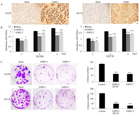 As shown in Figure 2B and Figure S5, ectopic EMP2 expression significantly inhibited NSCLC cell proliferation in comparison to mock control on day 1, 3, and 5 (p < 0.05, p < 0.01, or p < 0.001).