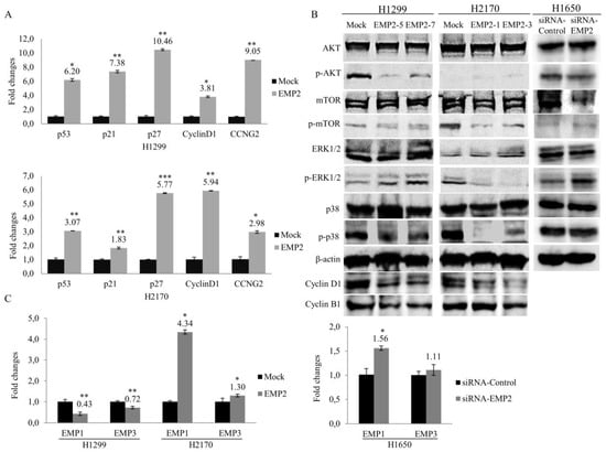 To investigate the molecular changes during cell cycle alteration, we evaluated the mRNA expression of the genes which are involved in the cell cycle regulation such as p53, p21, p27, cyclin D1, and CCNG2, showing that ectopic expression of EMP2 resulted in significant upregulation of all of these genes in both H1299 and H2170 (p < 0.05, p < 0.01, or p < 0.001; Figure 5A).