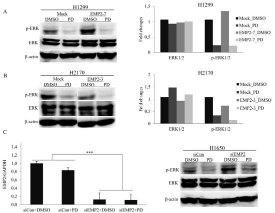 Influence of MEK inhibitor PD98059 (PD) on the expression level of phosphorylated ERK1/2 in NSCLC cells with ectopic expression of EMP2 or EMP2-knockdown. (A) PD98059 treatment led to a reduced expression level of p-ERK1/2 in H1299 cells. The expression level of p-ERK1/2 was enhanced in EMP2-transfected H1299 cells (EMP2-7) compared to mock cells after DMSO treatment. No altered expression level of p-ERK1/2 was found in EMP2-transfected H1299 cells compared to mock cells after PD98059 treatment (left). Densitometric quantification of the data from the Western blot analysis (right). (B) PD98059 treatment led to a reduced expression level of p-ERK1/2 in H2170 cells. In EMP2-transfected H2170 cells (EMP2-3), a decreased expression level of p-ERK1/2 was observed compared to mock cells after PD98059 treatment (left). Densitometric quantification of the data from the Western blot analysis (right) (C) A successful knockdown of EMP2 was confirmed by real-time RT-PCR analysis in H1650 cells treated with DMSO or PD98059 (left). H1650 cells treated with PD98059 showed reduced expression of p-ERK1/2 compared to cells treated with DMSO. Cells with EMP2 knockdown (siEMP2) exhibited more expression of p-ERK1/2 compared to mock cells (siCon) after PD98059 treatment (right). *** p < 0.001 when analyzed using Student’s t-test.