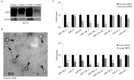 Analysis of the expression of nine miRNAs (miR-30d_2, miR-21, miR-802, miR-1301_2, miR-200a_1, miR-518-5p_1, miR-18a_2, miR-25_1, and miR-205_1) involved in cancer development in both exosomes and cell lysates from the EMP2 transfectants and mock cells was carried out. As shown in Figure 7C, the expression of exosome miRNAs, including miR-30d_2, miR-802 and miR-1301_2, miR-200a_1, and miR-518c-5p_1, was significantly decreased in EMP2-transfected H2170 cells compared to the mock control. For the miRNA isolated from the cell lysates, miR-30d_2, miR-21, miR-802, miR-1301_2, miR-200a_1, and miR-18a_2 expression was significantly downregulated in EMP2 overexpression.