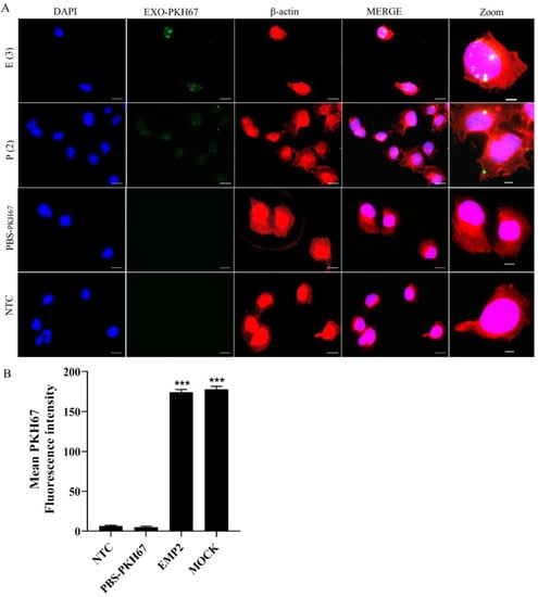 Uptake of exosomes by autologous cells. (A) Cellular uptake of autologous exosomes in H2170 cells imaged by confocal microscopy. The fluorescence of DAPI, β-actin, and that of EXOSOME-PKH67 are labeled with blue, red, and green, respectively. Scale bars: 10 µm. (B) Summary bar graphs of the relative mean fluorescence intensity (MFI) of PKH67 (exosomes) in recipient cells. The results are illustrated as the mean ± SEM of the relative MFI. *** p < 0.001 in comparison with nontreated cells (NTC) analyzed by one-way ANOVA with Bonferroni’s multiple comparisons test; E-Mock: Exosome of mock cells; E-EMP2: Exosomes of EMP2-transfected cells.