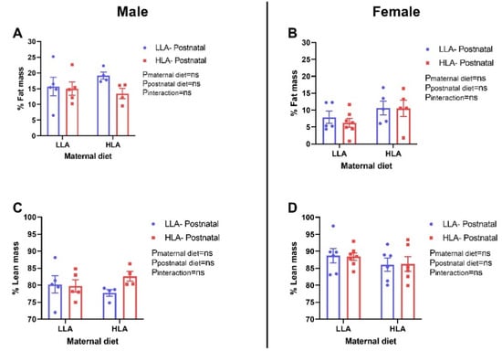 Effect of a maternal and postnatal diet high in linoleic acid on fat mass and lean mass in adult offspring. Data are presented as mean ± standard error of the mean (SEM). Two-way ANOVA was performed for statistical analysis with maternal diet and postnatal diet as two factors. n = 4–7. LLA: low linoleic acid; HLA: high linoleic acid; PN: postnatal. A: % Fat mass males, B: % Fat mass females, C: % Lean mass males, D: % Lean mass females