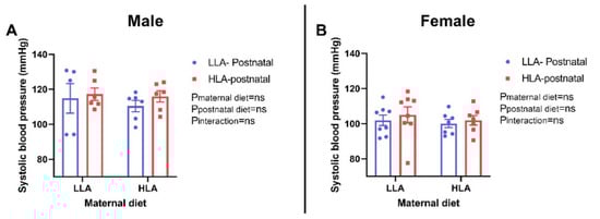 Effect of a maternal and postnatal diet high in linoleic acid on systolic blood pressure of adult offspring. Data are presented as mean ± standard error of the mean (SEM). Two-way ANOVA was performed for statistical analysis with maternal diet and postnatal diet as two factors. n = 5–8. LLA: low linoleic acid; HLA: high linoleic acid; PN: postnatal. A: Systolic blood pressure males; B: Systolic blood pressure females