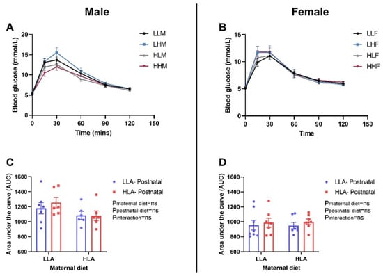 Effect of a maternal and postnatal diet high in linoleic acid on glucose tolerance in adult offspring. Data are presented as mean ± standard error of the mean (SEM). The area under the curve (AUC) was calculated using GraphPad Prism. Two-way ANOVA was performed for statistical analysis with maternal diet and postnatal diet as two factors. n = 6–8. LLA: low linoleic acid; HLA: high linoleic acid; PN: postnatal; GTT: glucose tolerance test. A: Blood glucose male; B: Blood glucose female; C: Area under the curve male; D: Area under the curve female.