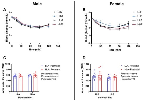 Effect of a maternal and postnatal diet high in linoleic acid on insulin tolerance in adult offspring. Data are presented as mean ± standard error of the mean (SEM). The area under the curve (AUC) was calculated using GraphPad Prism. Two-way ANOVA was performed for statistical analysis with maternal diet and postnatal diet as two factors. n = 6–8. LLA: low linoleic acid; HLA: high linoleic acid; PN: postnatal; ITT: insulin tolerance test. A: Blood glucose male; B: Blood glucose female; C: Area under the curve male; D: Area under the curve female.