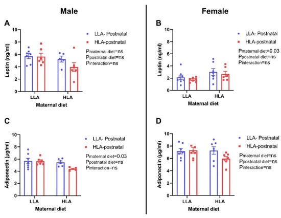 Effect of a maternal and postnatal diet high in linoleic acid on circulating leptin and adiponectin in adult offspring. Data are presented as mean ± standard error of the mean (SEM). Two-way ANOVA was performed for statistical analysis with maternal diet and postnatal diet as two factors. n = 5–8. LLA: low linoleic acid; HLA: high linoleic acid; PN: postnatal. A: Leptin concentration male; B: Leptin concentration female; C: Adiponectin concentration male; D: Adiponectin concentration female.