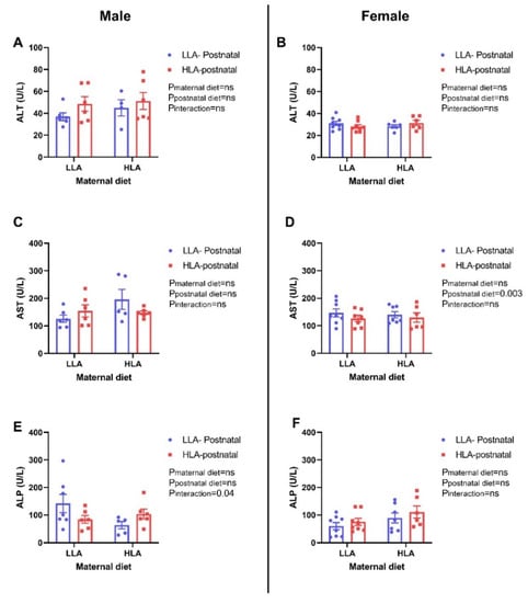 Effect of a maternal and postnatal diet high in linoleic acid on circulating liver enzymes in adult offspring. Data are presented as mean ± standard error of the mean (SEM). Two-way ANOVA was performed for statistical analysis with maternal diet and postnatal diet as two factors. n = 5–8. LLA: low linoleic acid; HLA: high linoleic acid; PN: postnatal; ALT: alanine transaminase; AST: aspartate transaminase; ALP: alkaline phosphatase. A: ALT concentration male; B: ALT concentration female; C: AST concentration male; D: AST concentration female; E: ALP concentration male; F: ALP concentration female.