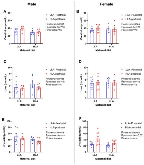 Effect of a maternal and postnatal diet high in linoleic acid on circulating creatinine, urea and uric acid in adult offspring. Data are presented as mean ± standard error of the mean (SEM). Two-way ANOVA was performed for statistical analysis with maternal diet and postnatal diet as two factors. n = 5–8. LLA: low linoleic acid; HLA: high linoleic acid; PN: postnatal. A: Creatinine concentration male; B: Creatinine concentration female; C: Urea concentration male; D: Urea concentration female; E: Uric acid concentration male; F: Uric acid concentration female.