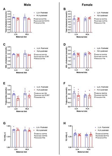 Effect of a maternal and postnatal diet high in linoleic acid on circulating lipid profile in adult offspring. Data are presented as mean ± standard error of the mean (SEM). Two-way ANOVA was performed for statistical analysis with maternal diet and postnatal diet as two factors. n = 5–8. LLA: low linoleic acid; HLA: high linoleic acid; PN: postnatal; TC: total cholesterol; HDL-C: high-density lipoprotein- cholesterol. A: Total cholesterol concentration male; B: Total cholesterol concentration female; C: HDL concentration male; D: HDL concentration female; E: Triglyceride concentration male; F: Triglyceride concentration female; G: Total cholesterol: HDL concentration male; H: Total cholesterol: HDL concentration female.