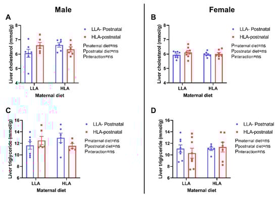 Effect of a maternal and postnatal diet high in linoleic acid on lipid concentration in the liver of adult offspring. Data are presented as mean ± standard error of the mean (SEM). Two-way ANOVA was performed for statistical analysis with maternal diet and postnatal diet as two factors. n = 6–8. LLA: low linoleic acid; HLA: high linoleic acid; PN: postnatal. A: Liver cholesterol concentration male; B: Liver cholesterol concentration female; C: Liver triglyceride concentration male; D: Liver triglyceride concentration female.