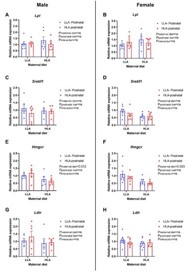 Effect of a maternal and postnatal diet high in linoleic acid on the expression of genes related to lipid metabolism in the liver of adult offspring. Data are presented as mean ± standard error of the mean (SEM). Two-way ANOVA was performed for statistical analysis with maternal diet and postnatal diet as two factors. n = 6–8. LLA: low linoleic acid; HLA: high linoleic acid; PN: postnatal. A: Lpl mRNA male; B: Lpl mRNA female; C: Srebf1 mRNA male; D: Srebf1 mRNA female; E: Hmgcr mRNA male; F: Hmgcr mRNA female; G: Ldlr mRNA male; H: Ldlr mRNA female.
