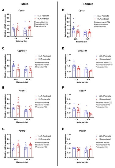 There were no differences in the hepatic expression of Lpl and Srebf1 in the offspring of both sexes (Figure 10A–D). Maternal HLA diet significantly downregulated the relative gene expression of Hmgcr in both male (Figure 10E, p = 0.12) and female (Figure 10F, p = 0.003) offspring. There was no difference in the expression of Ldlr in the liver of either sexes. Maternal HLA diet significantly downregulated the expression of hepatic Cpt1a in female offspring (Figure 11B, p = 0.024), however, it remained unchanged in male offspring. Maternal (p = 0.003) and postnatal (p = 0.015) HLA diet significantly decreased hepatic expression of Cyp27a1 in female offspring (Figure 11D), however, there was no changes in the expression of Cyp27a1 in the liver of male offspring. The hepatic expression of Aocx1 was significantly downregulated by maternal HLA diet in female offspring (Figure 11F, p = 0.003), however, the expression of Acox1 remained unchanged in the liver of male offspring. There was no change in the expression of Pparg in the hepatic tissue of both sexes.