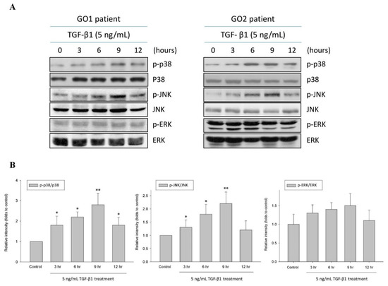 Upregulation of p38 and JNK phosphorylation by TGF-β1 in the primary cultured orbital fibroblasts from patients with Graves’ ophthalmopathy (GO). (A) After treating the orbital fibroblasts from GO patients with TGF-β1 (5 ng/mL), the phosphorylation levels of p38, JNK, and ERK were observed for 3, 6, 9, and 12 h by Western blots; (B) The expression ratios of p-p38 to p38, p-JNK to JNK, and p-ERK to ERK from the control without TGF-β1 treatment were defined as 1.0. Then, the other relative intensity (folds) was presented. By three independent Western blot experiments, data were averaged together from the same patient strain. The means of the different patient (GO1–GO4, n = 4) strains were averaged. The representative histogram was constructed based on the mean values of protein expression levels in the primary cultured orbital fibroblasts from the four GO patients. Data were presented as means ± S.D. of the results from three independent experiments. * p < 0.05 vs. control without TGF-β1 treatment; ** p < 0.01 vs. control without TGF-β1 treatment.