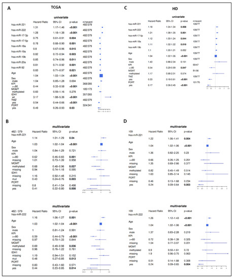 Uni- and multivariate analyses of miR expression for OS. Univariate analyses show a negative prognostic value for miR-221/222 ((A) TCGA and (C) HD). Multivariate analyses confirm their prognostic value (B,D). For members of the miR-17-92 cluster, a positive prognostic value was observed in the TCGA cohort (A); in HD, an unfavorable prognosis was found (C). Bold font indicates p-value ≤ 0.05 (Cox proportional hazard models, HR: hazard ratio; CI: confidence interval).