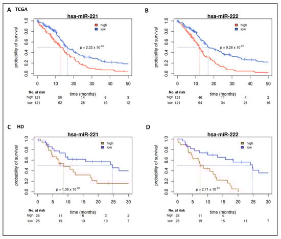 Prognostic value of miR-221 and miR-222. Kaplan–Meier survival curves for overall survival. High expression of miR-221 ((A): TCGA; (C): HD) and miR-222 ((B): TCGA, (D): HD) is associated with shorter OS in both cohorts. Median survival differences are 3.6 (16, HD cohort) months for miR-221 and 4.7 (17, HD cohort) months for miR-222 (Kaplan–Meier estimators and likelihood ratio test for groups of patients with expression below the first vs. above the third quartile).
