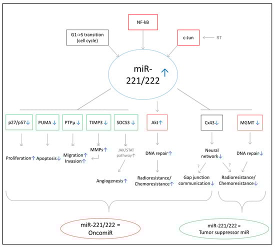 We report the expression of miR-221 and miR-222 as important prognostic factors in both the TCGA training (n = 482) and HD validation cohort (n = 109). MiR-221 and miR-222 are clustered together on chromosome Xp11.3 and have similar target specificity [29]. Their expression has been attributed to GBM [30,31,32,33,34,35]. The majority of previously published functional in vitro experiments suggests a pro-tumorigenic activity for the miR-221/222 family (Figure 5). Confirmed target genes underline their involvement in promoting cell cycle progression and proliferation (p27, p57), migration and invasion (PTPµ and TIMP3), DNA repair (Akt), radio- and chemo resistance (Akt), and angiogenesis (SOCS3) as well as inhibiting apoptosis (PUMA) and gap junction communication (Cx43) [34,36,37,38,39,40]. However, negative regulation of some target genes, such as MGMT and Cx43, may also elicit contrary effects and sensitize GBM to therapy (e.g., via inhibition of DNA repair (MGMT), inhibition of microtubule-dependent proliferation and invasion (Cx43), and enhancing radio- and chemo resistance (MGMT, Cx43)) [41,42,43,44]. Therefore, mechanistic studies are needed to explore the net effect of miR-221/222 expression on tumor microenvironment communication and tumor response to therapy. So far, miR-221/222 knockdown has been shown to reduce xenograft tumor growth in mouse models in vivo [30,35,39,40]. Overall, the majority of these studies point to an oncogenic function of miR-221/222, in alignment with our observation that reduced miR-221/222 expression correlated with improved OS in both studied cohorts of primary GBM patients.
