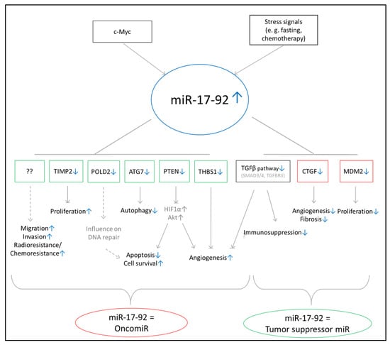 The miR-17-92 cluster consists of miR-17-3p, miR-17-5p, miR-18a, miR-19a, miR-19b, miR-20a, and miR-92a and was found to be upregulated in GBM cell lines and patient tumor samples [53,54,55]. Both the pro-tumorigenic as well as tumor-suppressive activity of the miR-17-92 cluster in GBM has previously been reported. The miR-17-92 cluster seems to be activated by c-Myc and cellular stress signals [56,57]. Confirmed target genes implicating an oncomiR function suggest their involvement in promoting proliferation (TIMP2), DNA repair and cell survival (POLD2, PTEN), and angiogenesis (TGFβ pathway, THBS1, PTEN) and inhibiting autophagy (ATG7) and apoptosis (POLD2) [53,55,56,57,58]. Additional in vitro experiments have showed the promotion of migration, invasion, and radio- and chemo resistance [58,59,60]. On the contrary, a tumor-suppressive function is proposed by the inhibition of proliferation (via MDM2), immunosuppression (via TGFβ), as well as angiogenesis and fibrosis (via CTGF) [57,61] (Figure 6).