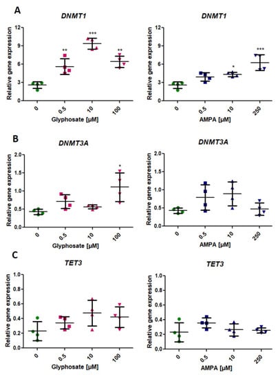 Woźniak, E.; Reszka, E.; Jabłońska, E.; Michałowicz, J.; Huras, B.; Bukowska, B. Glyphosate and AMPA Induce Alterations in Expression of Genes Involved in Chromatin Architecture in Human Peripheral Blood Mononuclear Cells (In Vitro). Int. J. Mol. Sci. 2021, 22, 2966. https://doi.org/10.3390/ijms22062966