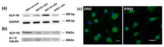Glucagon-like peptide-1 (GLP-1R) mRNA and protein expression in primary cultured dorsal root ganglion (DRG) neurons, NSC-34 and ND7/23 neuronal cell lines, and an IFRS1 Schwann cell line. (a) GLP-1R and glyceraldehyde-3-phosphate dehydrogenase (GAPDH) mRNA expression in the 4 kinds of cells; RT-PCR analysis. (b) GLP-1R and βI/II tubulin (a house-keeping protein used for confirmation of the proper reactions) expression in the 4 kinds of cells; Western blot analysis. (c) GLP-1R immunoreactivity in DRG neurons and IFRS1 cells; immunofluorescence. Nuclei are stained blue with 4’,6-diamidino-2-phenylindole (DAPI). Scale bars indicate 20 μm.