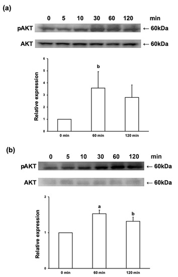 Treatment with 100 nM exendin-4 (Ex-4) induces phosphorylation of serine/threonine-specific protein kinase AKT in ND7/23 cells (a) and IFRS1 cells (b). The representative pictures of the Western blot analysis (upper) and quantitative data (relative phosphorylated AKT (p-AKT) expression at 0, 60, and 120 min after Ex-4 treatment; lower) are shown. Values represent means + SD from 3 experiments. a: p < 0.01 as compared with 0 min, b: p < 0.05 as compared with 0 min.