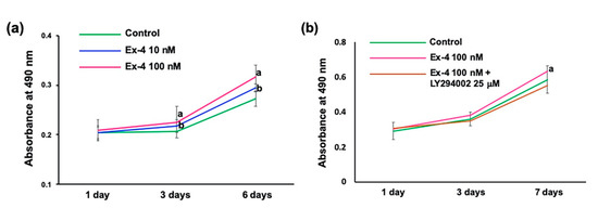 The effects of Ex-4 on the proliferation/survival of IFRS1 cells were evaluated using the CellTiter 96® Aqueous One Solution Cell Proliferation Assay kit (Promega Corp., Madison, WI, USA), as previously reported [18]. The cells were seeded onto each well of 96-well culture plates at an approximate density of 3 × 104/cm2 and were incubated overnight in DMEM supplemented with 5% FBS. The cells were then maintained in DMEM/1% FBS with different concentrations (0, 10, or 100 μM) of Ex-4 (R&D Systems, Inc., Minneapolis, MN, USA) for 1, 3, and 6 days. After rinsing with 250 μL of DMEM, the cells were incubated for 1 h at 37 °C in 100 μL of DMEM with 10 μL of CellTiter 96® Aqueous One Solution Reagent, and absorbance at 490 nm was determined with a microplate reader (Varioskan Flash; Thermo Fischer Scientific Inc., Waltham, MA, USA).