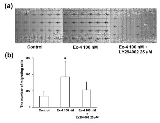 Ex-4 promotes migration of IFRS1 cells; scratch wound assay. (a) Representative photomicrographs of IFRS1 cells at 1 day after scratch. (b) The number of migrating cells at 1 day after treatment with 0 (Control) and 100 nM Ex-4 in the presence or absence of 25 μM LY294002. Values represent means + SD from 24 experiments. a: p < 0.01 as compared with Control and Ex-4 100 nM + LY294002 25 μM.