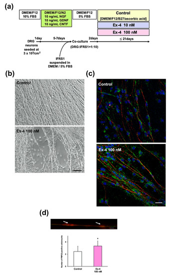 Myelinating co-culture of DRG neurons and IFRS1 cells was performed as previously reported [12] with slight modifications. Briefly, DRG neurons were seeded on type I collagen-coated 2-well chamber slides (Matsunami Glass Ind., LTD, Osaka, Japan) and Aclar fluorocarbon coverslips (Nissin EM Co., Tokyo, Japan) at an approximate density of 2 × 103/cm2 and maintained for 5-7 days in DMEM/F12 containing N2 supplement (Thermo Fisher Scientific Inc., Waltham, MA, USA), 10 ng/mL nerve growth factor (NGF; R&D Systems, Inc., Minneapolis, MN, USA), 10 ng/mL glial cell line-derived neurotrophic factor (GDNF; R&D Systems, Inc., Minneapolis, MN, USA), and 10 ng/mL ciliary neurotrophic factor (CNTF; PeproTech, Rocky Hill, NJ, USA). The cell density ratio of DRG neurons to IFRS1 cells was adjusted to 1:10. The co-cultured DRG neurons and IFRS1 cells were incubated for 2 days in DMEM/F12 supplemented with 5% FBS and then maintained for up to 28 days in DMEM/F12 containing B27 supplement (Thermo Fisher Scientific Inc., Waltham, MA, USA), 50 μg/mL ascorbic acid (FUJIFILM Wako Pure Chemical Corp., Osaka, Japan), and different concentrations (0, 10, or 100 μM) of Ex-4.