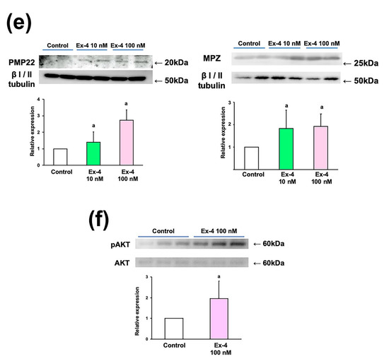 Ex-4 accelerated DRG neuronal cell survival and neurite outgrowth [10] and Schwann cell survival and migration (Figure 3 and Figure 4). These findings together with the previous in vivo study [7] led us to expect Ex-4′s positive effects on myelination in DRG neuron–IFRS1 co-culture system [12,13]. DRG neurons were maintained for a week in a serum-free culture medium with the mixture of neurotrophic factors (10 ng/mL of nerve growth factor (NGF), glial cell line-derived neurotrophic factor (GDNF), and ciliary neurotrophic factor (CNTF)) to promote neurite outgrowth. The neurons were then co-cultured with IFRS1 Schwann cells and maintained for up to 3 weeks under serum-free culture conditions in the presence or absence of 10 nM or 100 nM Ex-4 (Figure 5a). Phase-contrast micrographs at 14 days of co-culture (Figure 5b) showed increased cell-free area among neurite bundles in Ex-4-treated cells compared with Control, suggesting that Ex-4 accelerated the migration of IFRS1 cells toward the neurites emerging from DRG neurons. Immunocytochemistry conducted at 21 days of co-culture indicate that Ex-4 increased the immunoreactivity to peripheral myelin protein (PMP) 22 (green) in IFRS1 cells surrounding βIII tubulin-immunoreactive DRG neurites (red) (Figure 5c). For the quantitative analysis, we counted the number of PMP22-immunoreactive IFRS1 cells attached to a neurite in each photomicrograph, in a similar manner to our previous study [22]. The average number of IFRS1 cells attached to a neurite is 2.4 ± 0.9 in Control and 3.3 ± 0.8 in 100 nM Ex-4 (n ≥ 9 neurites from 3 co-culture samples); the latter is significantly higher than the former (p < 0.05) (Figure 5d). Consistent with these findings, Western blot analysis revealed that Ex-4 significantly upregulated the expression of PMP22 and myelin protein zero (MPZ) at 21 days of co-culture (Figure 5e). Furthermore, Ex-4-induced AKT phosphorylation at 2 days of co-culture (Figure 5f) agrees with the involvement of PI3K/AKT signaling pathway in the stimulatory effects of Ex-4 toward both DRG neurons [10] and IFRS1 cells (Figure 2 and Figure 3).