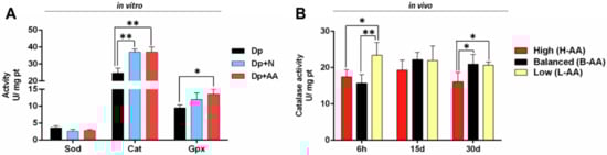 2.2. AA Supplementation Promotes Changes in Antioxidant Enzyme Activity In Vitro and In Vivo