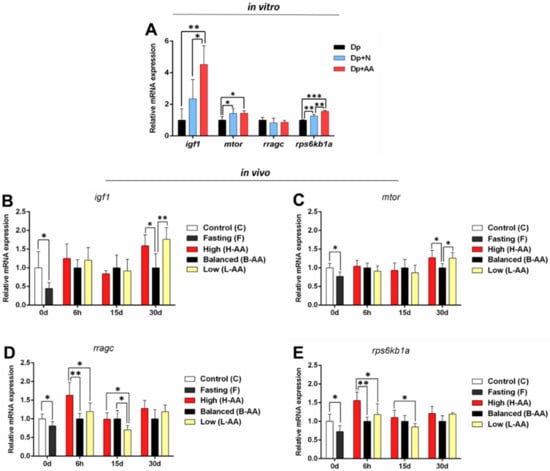 - Paula, T.G.; Zanella, B.T.T.; Fantinatti, B.E.d.A.; Moraes, L.N.d.; Duran, B.O.d.S.; Oliveira, C.B.d.; Salomão, R.A.S.; Silva, R.N.d.; Padovani, C.R.; dos Santos, V.B.; et al. Food restriction increase the expression of mTORC1 complex genes in the skeletal muscle of juvenile pacu (Piaractus mesopotamicus). PLoS ONE 2017, 12, e0177679. [Google Scholar] [CrossRef]